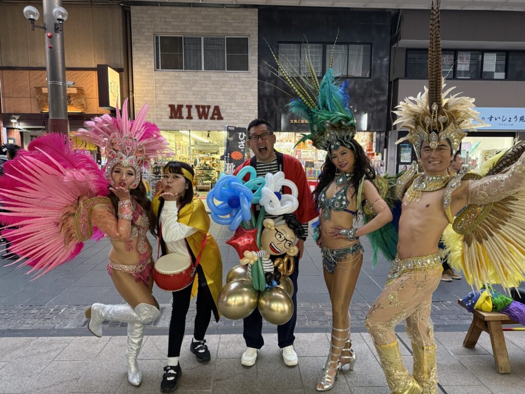 メンバーは固定ではなく常に新陳代謝(入れ替わり)をしています。つまりゴーフィーニャスというブランドを熊本のサンバダンサーが諸活動を通じて磨き上げているということ。サンバ界のAKB48的な(笑)存在といってもいいかなと。サンバダンサーMasashiが企画&プロデュースしています。